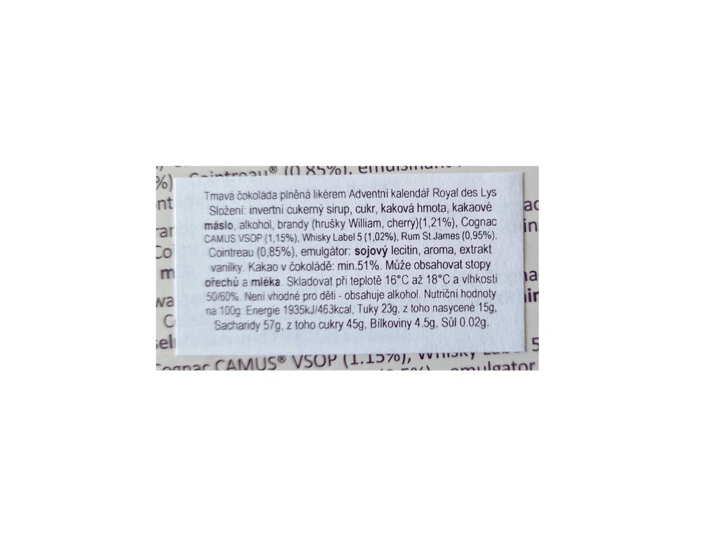 Kalendář Royal des Lys je nejen sladkým potěšením, ale i stylovým dárkem pro milovníky kvalitní čokolády, likérů a destilátů. Vyrobeno ve Francii z poctivých surovin, s důrazem na tradiční recepturu a ruční zpracování.