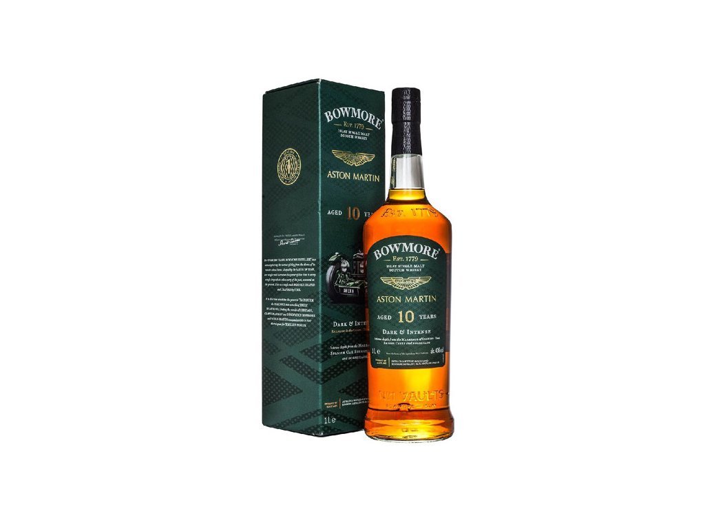 Bowmore 10 Y.O. Aston Martin z edice Designed by Aston Martin je single malt whisky z Islay, která kombinuje sílu rašelinného kouře s elegancí sherry sudů. Zrála v sudech po sherry a v silně vypálených dubových sudech, což jí dodává intenzivní charakter a výrazně tmavě jantarovou barvu.