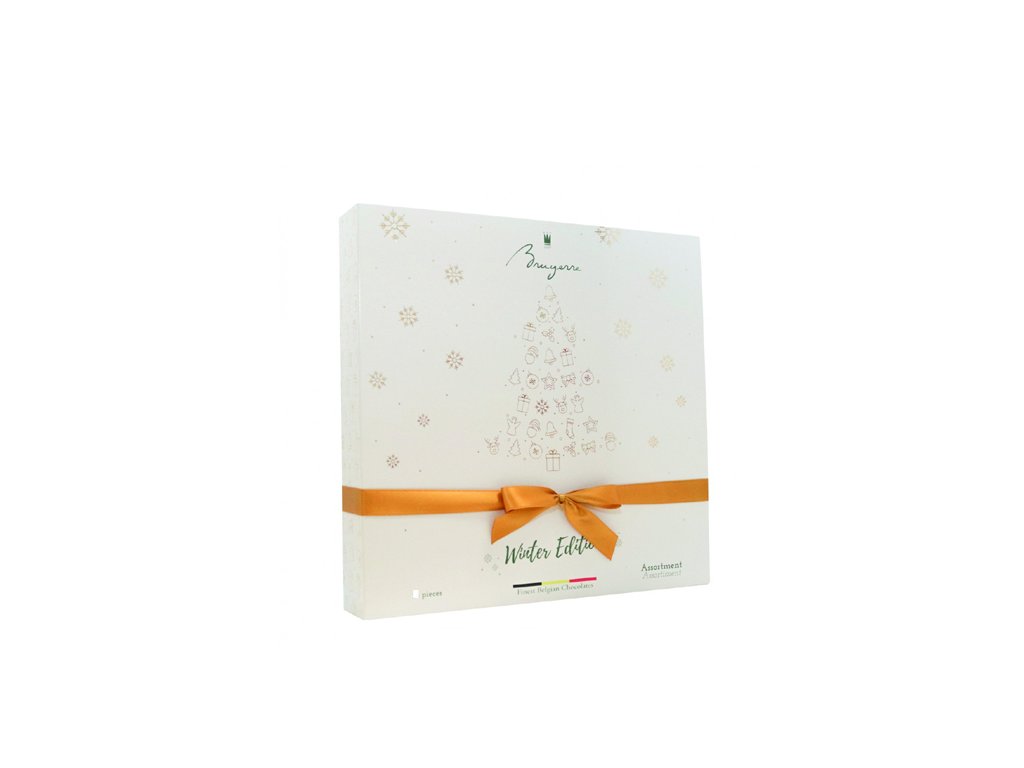Každý kousek pochází z dílny tradiční čokoládovny Bruyerre, jejíž historie sahá až do roku 1909. Pralinky jsou vyráběny z nejlepších ingrediencí – pravého kakaového másla, čerstvé smetany, oříšků a ovocných náplní. Chuťově dokonale vyvážená kolekce nabízí kombinaci mléčné, hořké i bílé čokolády, doplněné o klasické i sezónní příchutě, které evokují vánoční atmosféru.