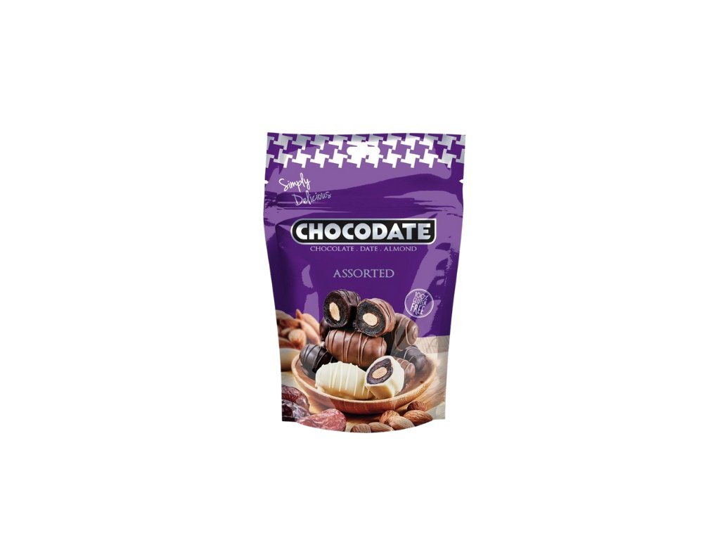Chocodate Assorted – výběrový mix dubajských datlí s mandlí v čokoládě nabízí čtyři lahodné varianty v jednom balení: mléčnou, hořkou, kokosovou a bílou. Každý Chocodate je tvořen dokonale zralou datlí, ručně plněnou praženou mandlí a obalenou v jemné vrstvě kvalitní čokolády.